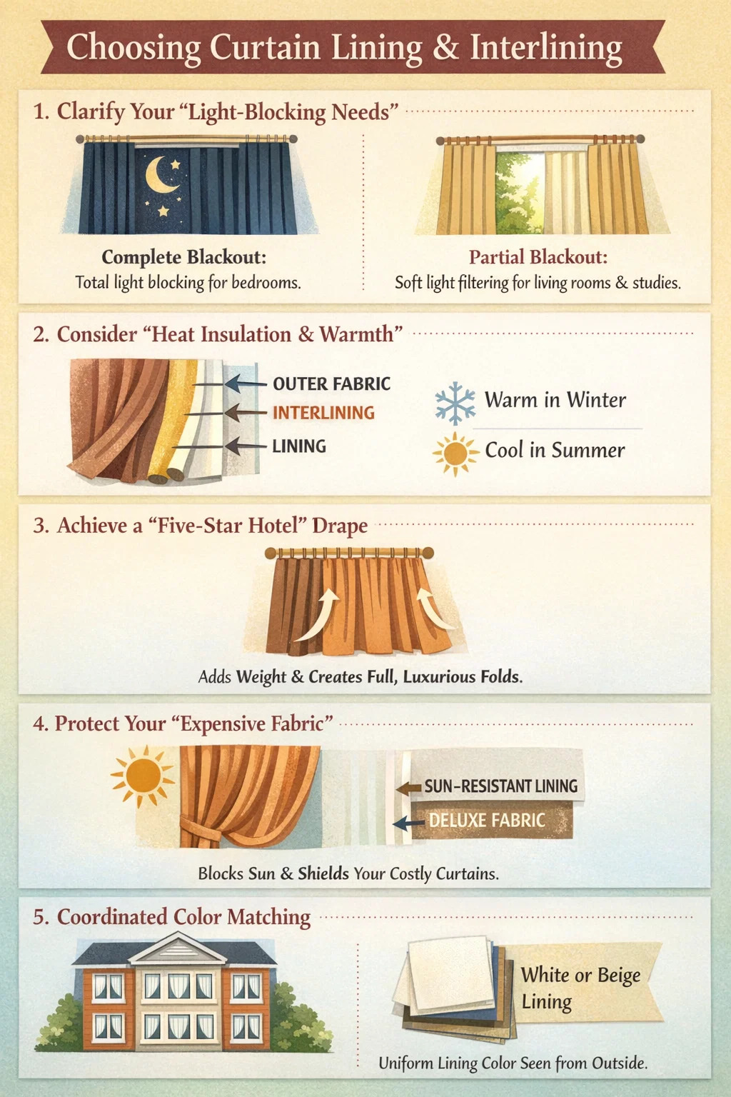 Výběr záclonové podšívky a vložka je jako oblékat si záclony do „spodního prádla“ a „svrchního oblečení“. Vnější látka určuje, jak krásně záclony vypadají, zatímco tyto dvě vnitřní vrstvy určují, jak jsou funkční a dobře se zatahují.