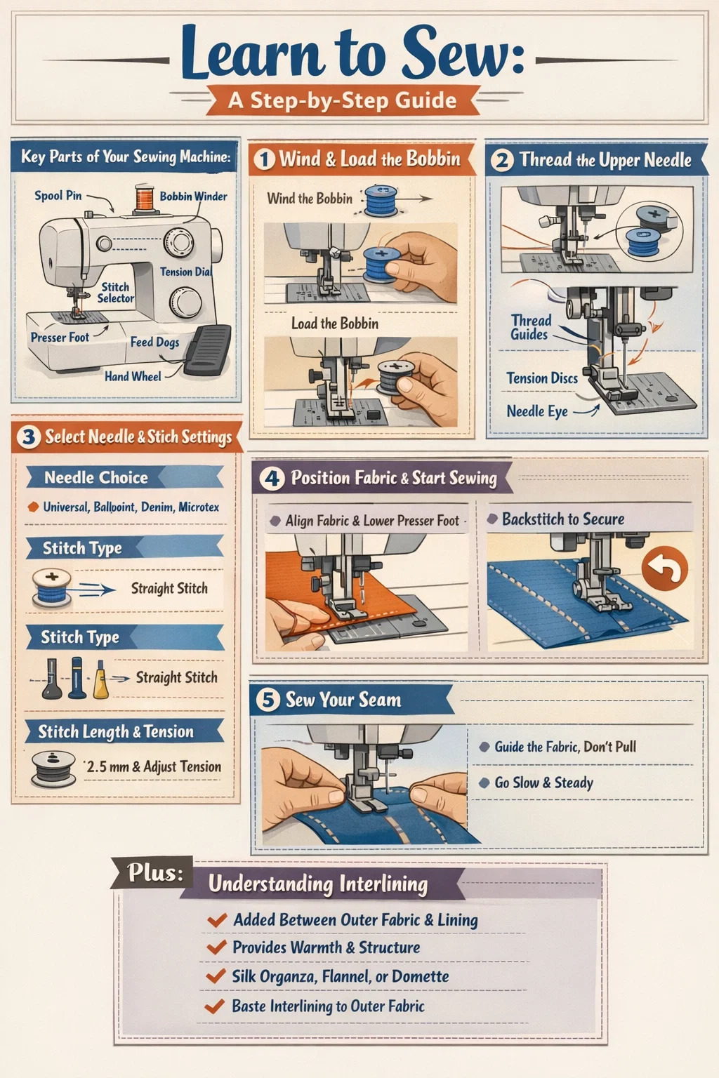Naučit se pracovat se šicím strojem krok za krokem je jednodušší, než většina začátečníků očekává. Základní proces spočívá v pěti akcích: nastavení stroje, navinutí a naložení cívky, navlečení horní jehly, výběr stehu a šití. Jakmile budete mít tyto základy, můžete se pustit do všeho od základních lemů až po strukturované oděvy, které se používají vložka — skrytá vrstva všitá mezi vnější látku a podšívku, která dodává tělo, tvar a teplo. Tento průvodce podrobně projde každým krokem, takže se můžete dostat od úplného začátečníka až po sebevědomého šiřitele.