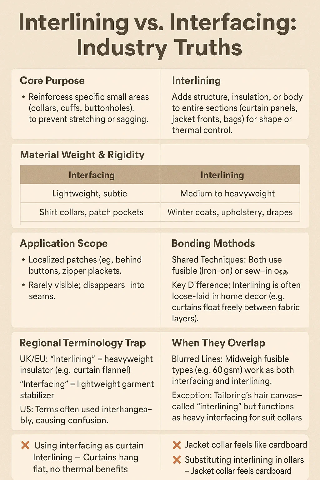Interlining: přidává strukturu, izolaci nebo tělo do celých sekcí (panely záclon, fronty bundy, tašky) pro tvar nebo tepelné ovládání.