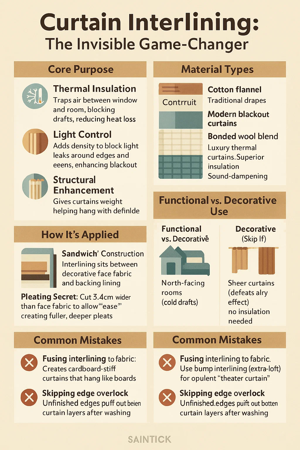 Heavy Velvets/Damasks: Použijte bump interlining (extra-loft) pro opulentní „divadelní závěs“ hmotnost.