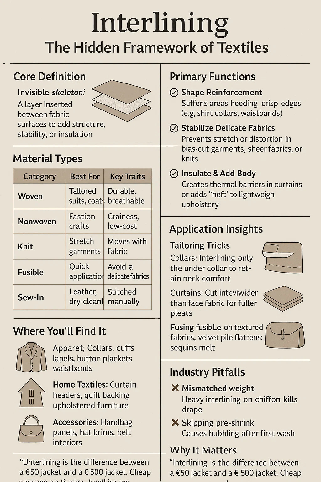 "Interlining je rozdíl mezi bundou 50 EUR a bundou 500 EUR. Levné verze prasknutí po suchém čištění; luxusní typy přežívají vnější tkaninu." - na míru na míru, Milán