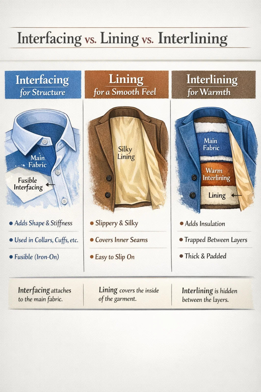 Při výrobě oděvů, spojování, podšívkování a vložka jsou jako tři neopěvovaní hrdinové pracující v zákulisí. Každý z nich hraje odlišnou roli při přeměně hebké látky na strukturovaný, teplý a pohodlný hotový oděv.