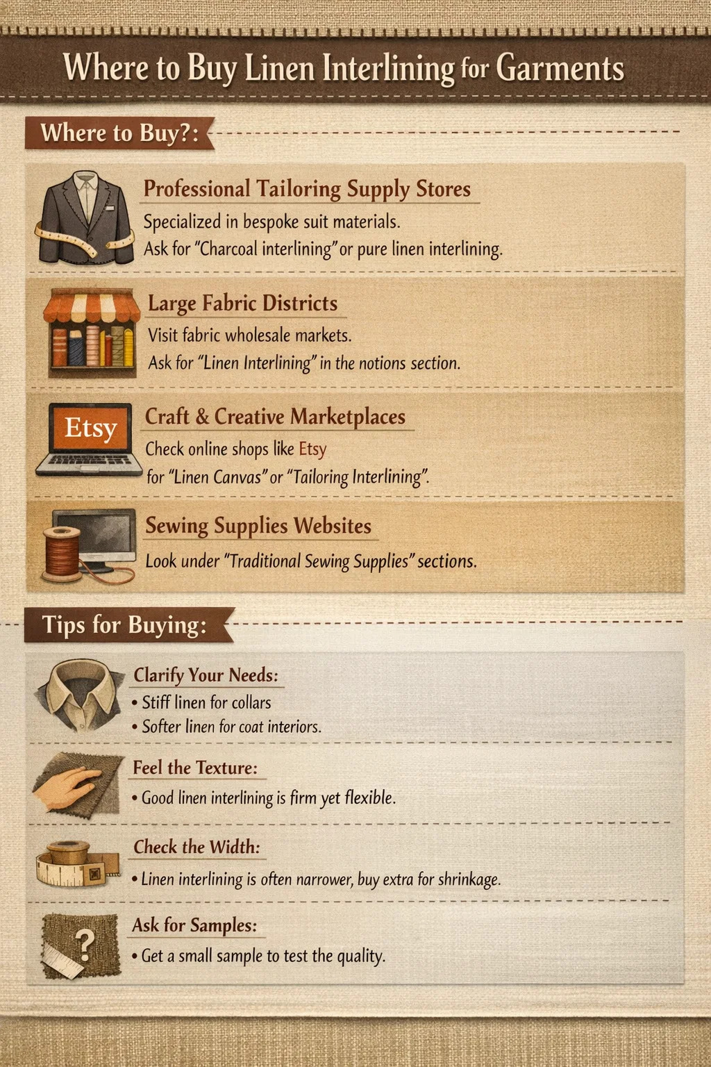 Některé webové stránky věnované nadšencům šití nabízejí velmi podrobné kategorie. Hledejte sekce, které prodávají „tradiční šicí potřeby“, protože moderní rychlá móda často používá plastovou tavnou vložku, zatímco vysoce kvalitní ručně vyráběné oděvy používají lněnou vložku.